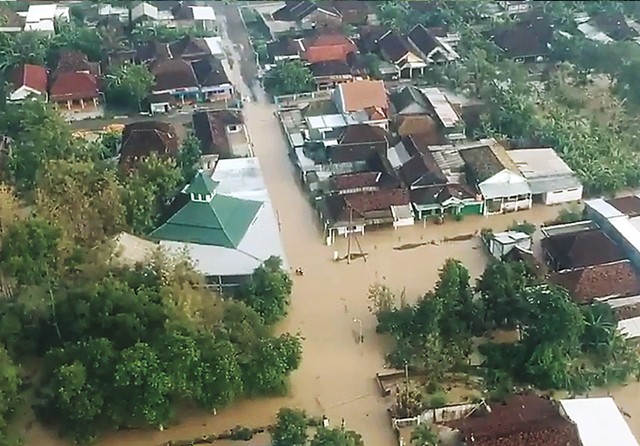 DUKA AWAL TAHUN: Kondisi Desa Sedapurklagen, Kecamatan Benjeng, terkepung banjir karena luapan Kali Lamong. (Istimewa)