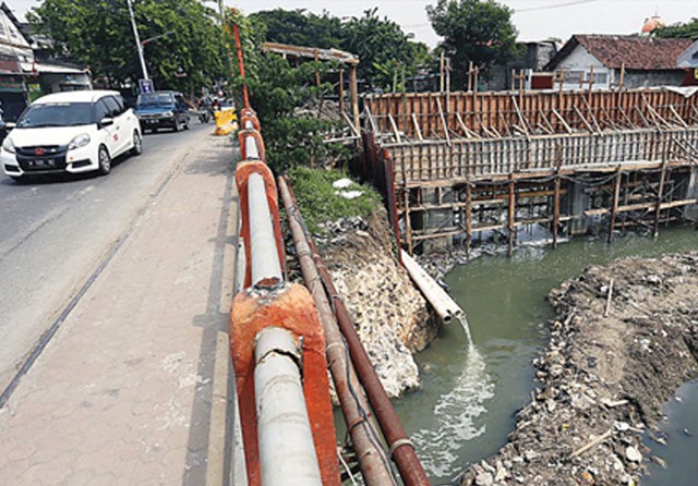 ”Kalau hujan deras, memang sulit. Dipengaruhi faktor lebar sungainya di situ,” terangnya. Untuk memudahkan pengerjaan, pintu air yang sebelumnya berdiri di samping jembatan lama dibongkar.