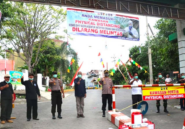 ROLE MODEL: Jajaran Polres Gresik mulai menguji coba physical distancing di Perumahan Bougenville, Kecamatan Kedamean, kemarin. Kebijakan itu membatasi ruang gerak warga sehingga diharapkan memutus mata rantai persebaran Covid-19. (Laudry Prayoga/Jawa Pos