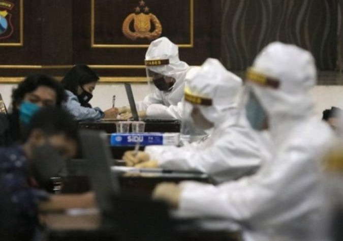 Petugas melakukan pemeriksaan cepat Covid-19 kepada warga yang terjaring razia pembatasan aktivitas malam hari di Polrestabes Surabaya beberapa waktu lalu. Didik Suhartono/Antara