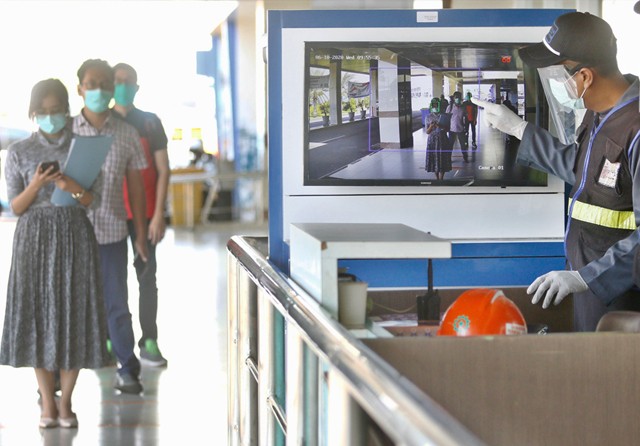 KETATKAN ATURAN: Petugas keamanan memantau suhu tubuh calon penumpang kapal di area Terminal Gapura Surya Pelabuhan Tanjung Perak, Rabu (10/6). (Ahmad Khusaini/Jawa Pos)