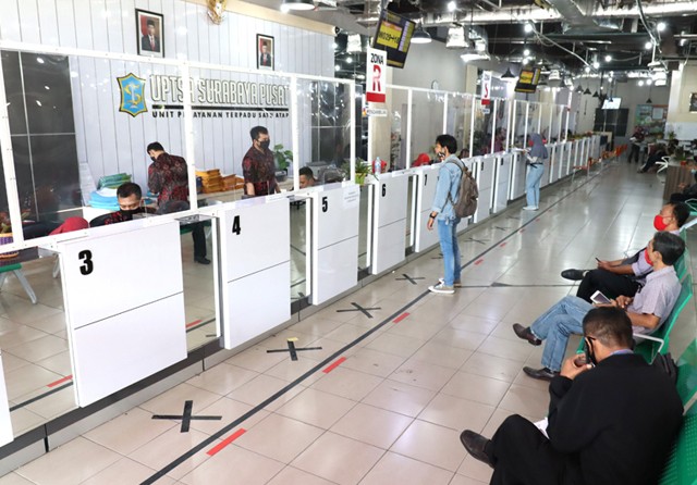 JawaPos.com - Pelayanan publik di Pemkot Surabaya menggunakan standar baru sesuai dengan protokol kesehatan pencegahan Covid-19. Mal pelayanan publik di gedung Siola memasang pembatas tembus pandang yang memisahkan pemohon dan petugas.