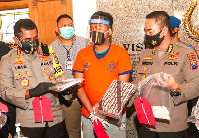 ANCAM KORBAN: Dari kiri, Kapolrestabes Surabaya Kombespol Johnny Eddizon Isir, tersangka Gilang, dan Kabidhumas Polda Jatim Kombespol Trunoyudo Wisnu saat ungkap kasus pelecehan seksual di Mapolrestabes Surabaya, Sabtu (8/8). (Dimas Maulana/Jawa Pos)