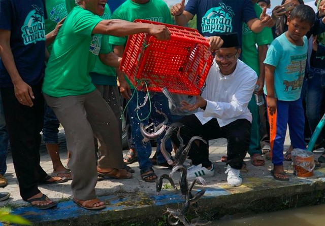 Gus Muhdlor saat melepas lele di kolam di Dusun Dukuh, Desa Ngaresrejo, Sukodono. (Istimewa)