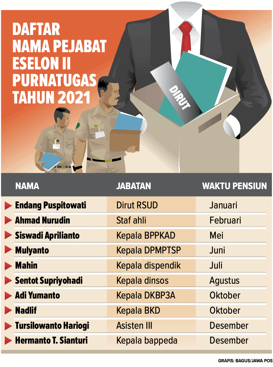 Data yang didapat Jawa Pos, para pejabat eselon II yang pensiun tahun depan, antara lain, Dirut RSUD Ibnu Sina dr Endang Puspitowati SpTHT-KL (Januari). Lalu, Ahmad Nurudin (staf ahli bupati) pensiun pada Februari dan Kepala Badan Pengelolaan Pendapatan Keuangan dan Aset Daerah (BPPKAD) Siswadi Aprilianto pada Mei mendatang.