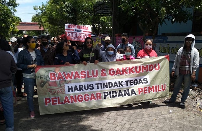 JawaPos.com–Puluhan warga yang beraliansi dalam Elemen Masyarakat Peduli Pemilu (EMPP) berkumpul di depan Kantor Bawaslu Surabaya pada Selasa (3/11). Mereka mempertanyakan netralitas dan kinerja Bawaslu. Mereka menuntut Bawaslu menjalankan fungsi dan tugas dengan baik dan bertanggung jawab dalam Pilkada 2020.
