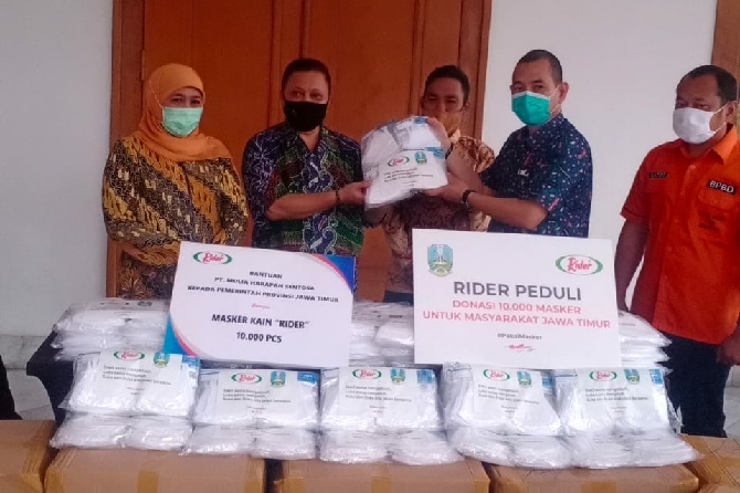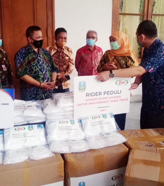 JawaPos.com – Bertempat di Gedung Grahadi, Surabaya – Jawa Timur, brand RIDER melakukan Gerakan CSR berupa RIDER PEDULI dengan berbagi 10.000 masker kain untuk Masyarakat Jawa Timur. Donasi masker diberikan secara simbolis kepada Pemerintah Provinsi Jawa Timur yang dihadiri oleh Gubernur Jawa Timur, Khofifah Indar Parawansa dengan didampingi staff Gubernur serta perwakilan dari pihak management RIDER.