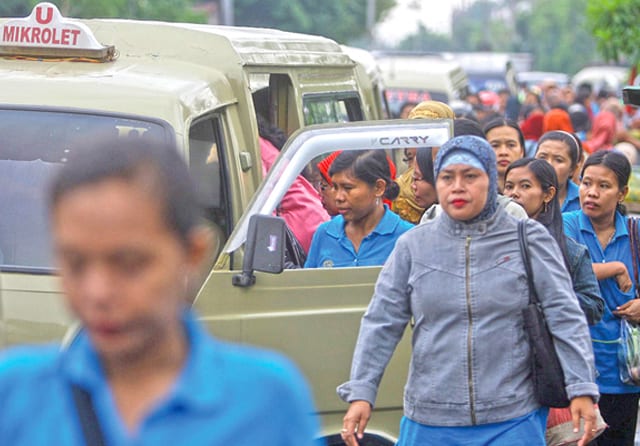 MENCARI PENGHIDUPAN: Para pekerja akan berangkat ke pabrik. UMK untuk tahun ini tetap. (Dite Surendra/Jawa Pos)