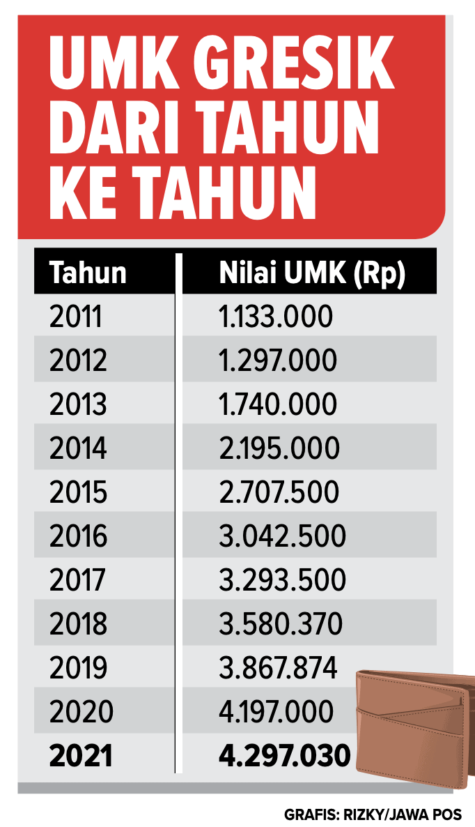 Dalam 10 tahun terakhir atau sejak era Bupati Sambari Halim Radianto dan Wabup Moh. Qosim, besaran UMK Gresik tercatat terus mengalami kenaikan. Pada 2011, misalnya, nilai UMK hanya Rp 1.133.000. Jika dibandingkan dengan UMK 2021, setidaknya ada kenaikan Rp 3.164.030. Untuk UMK 2021 di kabupaten tetangga, Lamongan sebesar Rp 2.488.724, Tuban Rp 2.532.234, dan Bojonegoro Rp 2.066.781.