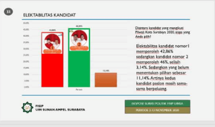 JawaPos.com–Fakultas Ilmu Sosial dan Ilmu Politik (FISIP) Universitas Islam Negeri Sunan Ampel (UINSA) merilis ekspose survei politik secara daring pada Selasa (24/11). Dalam rilis tersebut, elektabilitas Pasangan Calon (Paslon) Nomor Urut Dua Machfud Arifin-Mujiaman unggul sebesar 46 persen. Mereka unggul dibandingkan Paslon Nomor Satu Eri Cahyadi-Armuji dengan angka 42,86 persen.