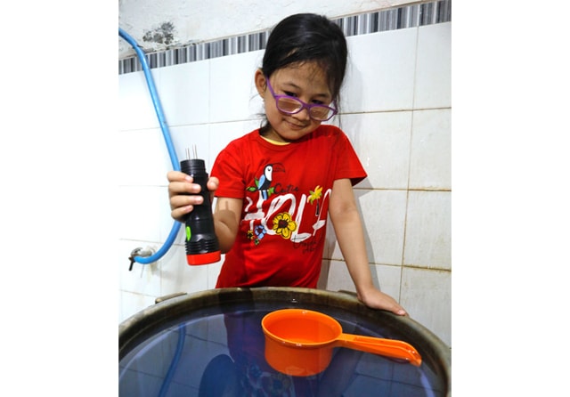 HARUS RUTIN: Adzkia Vianna, salah seorang warga, memeriksa kondisi bak kamar mandi untuk memastikan ada tidaknya jentik nyamuk. (Angger Bondan/Jawa Pos)