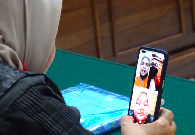 ABAL-ABAL: Jaksa Lujeng mendengarkan keterangan terdakwa Panji Permana melalui telekonferensi dalam sidang di PN Surabaya. (Lugas Wicaksono/Jawa Pos)