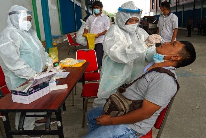 Tes cepat antigen oleh tim Satgas Covid-19 Pemkab Bangkalan di lokasi penyekatan Labang, Bangkalan, Senin (7/6). Abd Aziz/Antara - Image