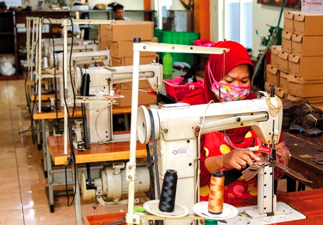 BUTUH DUKUNGAN: Nunuk sedang menjahit pesanan sandal dan sepatu di KUB Mampu Jaya, Putat Jaya, kemarin. Selama pandemi, kampung kreatif Dolly mengalami kenaikan pesanan hingga 15 persen. (Alfian Rizal/Jawa Pos)