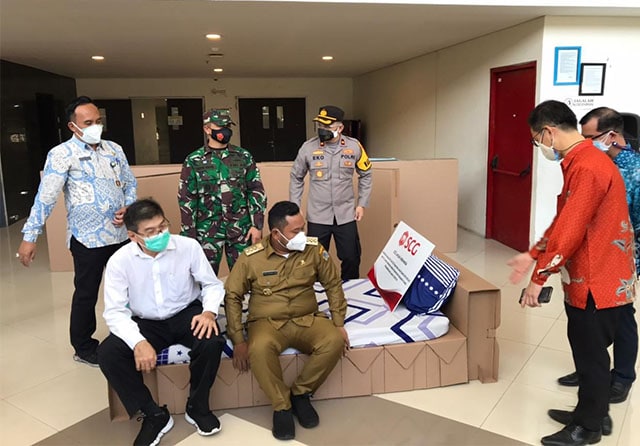 Di lantai 1 Stadion Gejos, sejak pagi terlihat tumpukan kardus-kardus. Rupanya, kardus itu akan menjadi tempat tidur para pasien Covid-19 yang dirawat di RSL Gejos. Setelah dilakukan serah terima secara simbolis, Yani, sapaan Bupati Fandi Akhmad Yani, melihat langsung pegawai dari PT SCG melakukan demo pemasangan TT dari kardus itu. Setelah jadi, bentuknya persis dengan TT pada umumnya. Nanti TT dari kardus itu juga akan dilapisi kasur di atasnya dan dilengkapi bantal, guling, serta selimut.