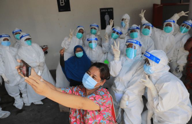 Pasien Covid-19 di Rumah Sakit Lapangan Tembak bersama tenaga kesehatan. Alfian Rizal/JawaPos