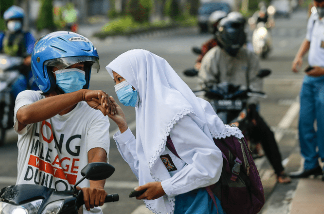Seorang siswa SMAN 5 Surabaya berpamitan pada orang tuanya sebelum sekolah. Dipta Wahyu/JawaPos