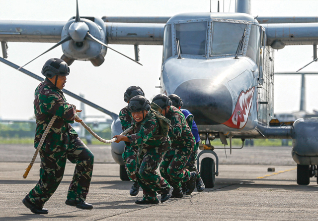 KERJA SAMA TIM: Para anggota TNI AL berusaha menarik pesawat Nomad di Juanda, Senin. (Dipta Wahyu/Jawa Pos)