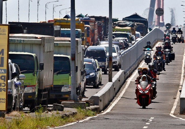 MACET PANJANG: Deretan kendaraan antre di Jembatan Suramadu untuk masuk ke Surabaya. Kendaraan yang melintas didominasi mobil pribadi. (Ahmad Khusaini/Jawa Pos)