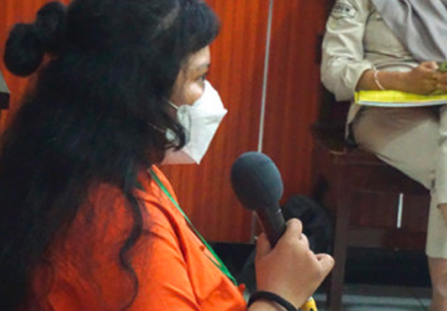PEMBERANI: Gitta Dwi Putri Haryanti menceritakan kronologi sehigga dapat menangkap pelaku dalam sidang di PN Surabaya. (Lugas Wicaksono/Jawa Pos)