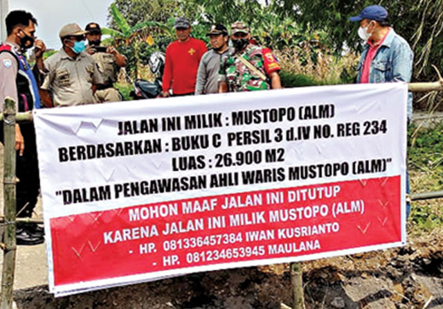 Di akses tersebut terdapat baner bertuliskan: Jalan ini milik Mustopo (alm) berdasarkan buku C persil 3d.IV No. Reg 234, Luas 26.900 m2, dalam pengawasan ahli waris. Mohon maaf jalan ini ditutup karena jalan ini milik Mustopo (Alm).