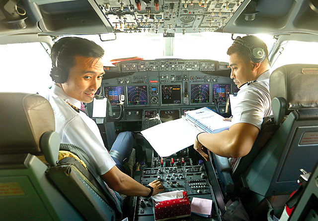 PARTIKAN AMAN: Refaldi Rachmat Pratama (kiri), pilot Batik Air, bersama kopilot Marco Yossie Asnomo melakukan pengecekan sebelum penerbangan Batir Air rute Surabaya-Singapura Jumat (23/9). (Angger Bondan/Jawa Pos)