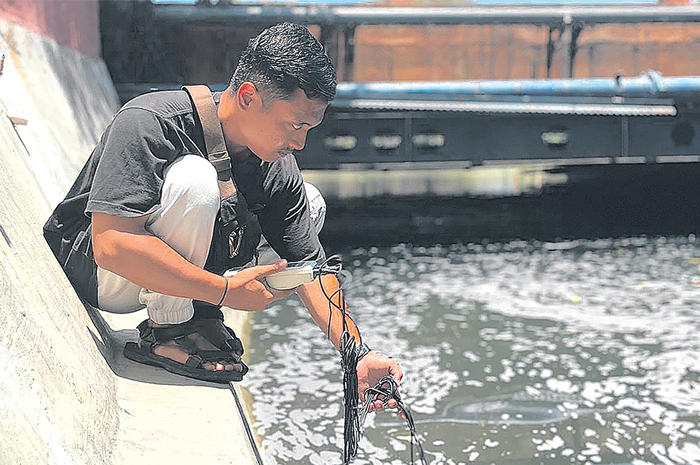 PANTAU KUALITAS: Staf Divisi Edukasi Ecoton Alaika Rahmatullah memantau kualitas air di Sungai Darmo Kali.