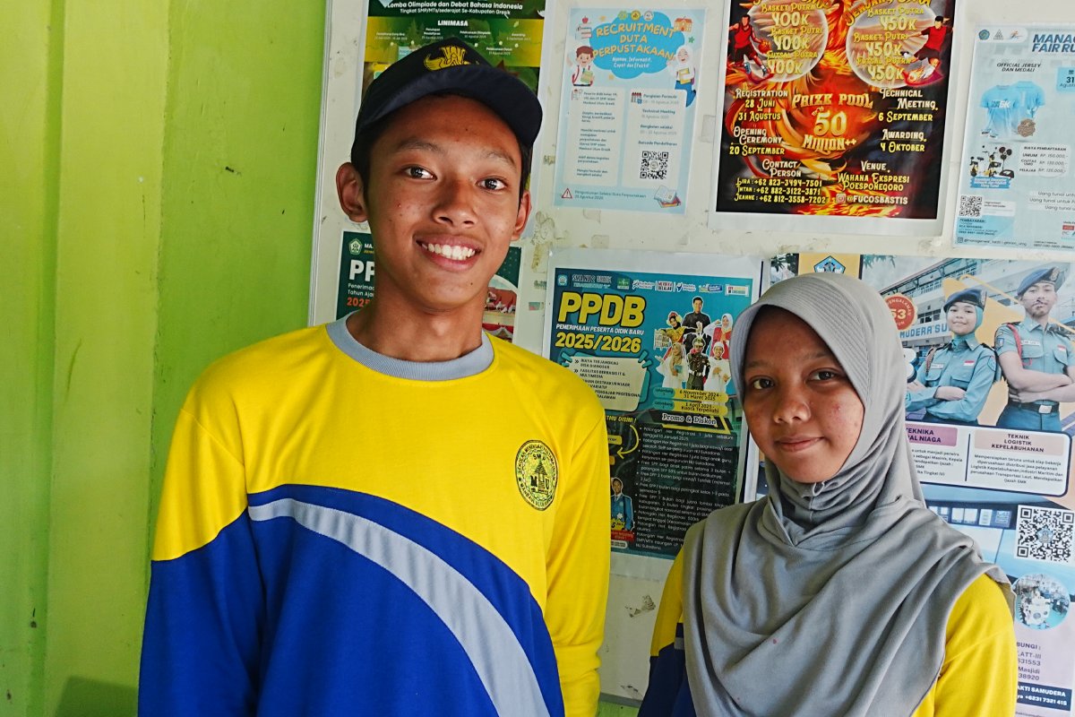 Toriq Hanan Maulana dan Nabilatul Karimah menceritakan pengalaman seru terkait program Makan Bergizi Gratis di SMP Islam Manbaul Ulum, Jumat (12/9/2025). (Moch. Rizky Pratama Putra/JawaPos.com)