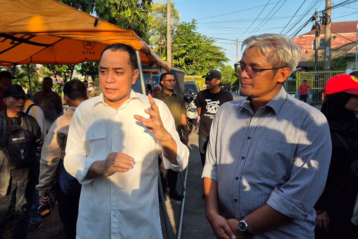 Kepala BPBD Surabaya Irvan Widyanto sebut semburan air bercampur gas metana di Sungai Rungkut Madya, tak berbahaya. Warga diimbau jangan panik. (Novia Herawati/ JawaPos.com)