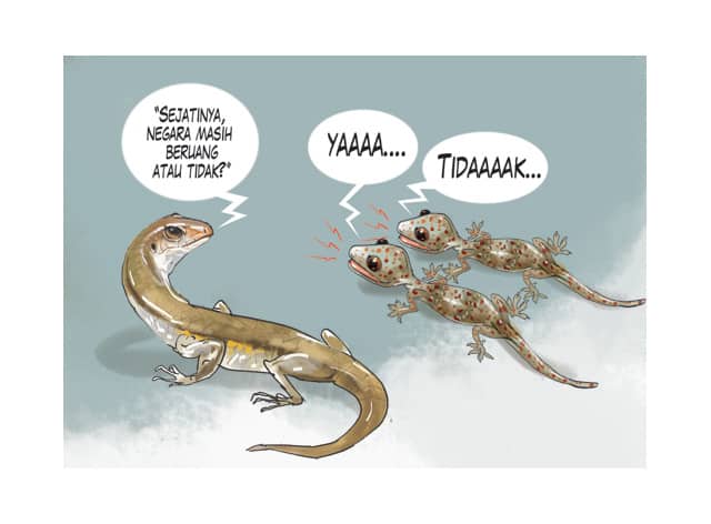 Umat, dengan juru bicara kadal, bertanya, ”Sejatinya, negara masih beruang atau tidak?”