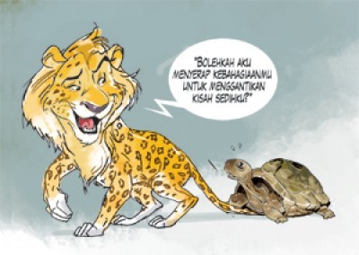 Ternyata di pucuk gunung hanya ada mutan. Tubuhnya kura-kura. Mukanya Petruk sekali. Ia terbang dengan sekerat tahu di tapak kaki-kaki kirinya, sekerat tempe di tapak-tapak yang kanan.