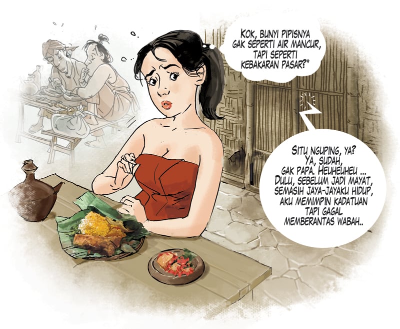 ”Situ nguping, ya?” perempuan di dalam bilik berseru. ”Ya, sudah, gak papa. Heuheuheu… Dulu semasih jaya-jayaku hidup, aku memimpin kadatuan, tapi gagal memberantas wabah…”