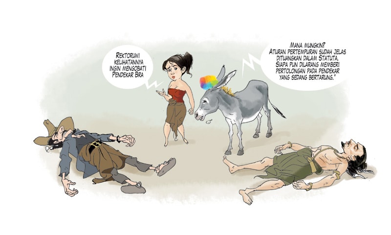 ”Mana mungkin?” keledai yang akrab dipanggil Thai itu menukas. ”Aturan pertempuran sudah jelas dituangkan dalam statuta. Siapa pun dilarang memberi pertolongan pada pendekar yang sedang bertarung.”