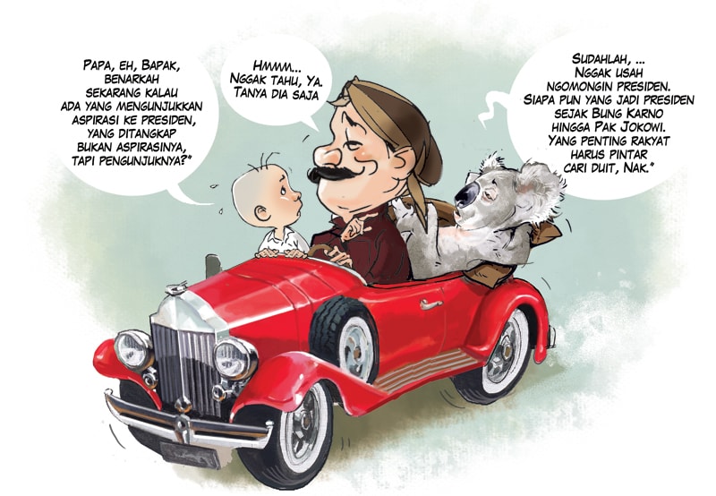 ”Sudahlah,” koala mengganti silang kakinya. ”Nggak usah ngomongin presiden. Siapa pun yang jadi presiden sejak Bung Karno hingga Pak Jokowi. Yang penting rakyat harus pintar cari duit, Nak.”