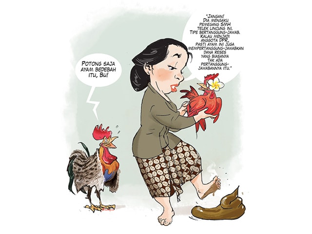 ”Potong saja ayam bedebah itu, Bu?” pinta Lombok Ijo, nama ayam berbulu musang piaraan keluarga Sastro-Jendro.