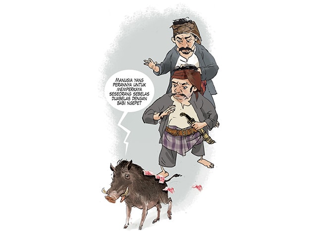 Kenapa pantang? Pendekar harus fokus! Ngobrol ngalor-ngidul, misal dari soal perahu yang tenggelam sampai babi ngepet? Pamali, kata orang Sunda. Ndak ilok, kalau dalam bahasa Jawa. Apalagi kalau sambil menyandar tiang gardu, di antara rembulan dan suara derik tonggeret, di sana sini masih ditambahi bumbu: perahu tenggelam, rakyat saweran untuk beli penggantinya, kok, tak ada satu pun petinggi mundur; kok, orang lebih sibuk dengan babi ngepet ketimbang manusia ngepet?