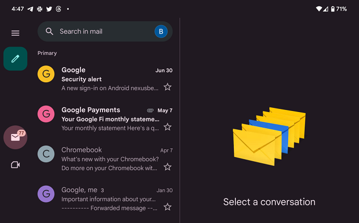 Pembaruan baru, harus dicatat, tampaknya hanya tersedia untuk perangkat lipat. Pembaruan UI Gmail sekarang terlihat di Google Pixel Fold meskipun saat ini masih kurang di perangkat lain. Pembaruan UI ini sementara masih belum terlihat di Samsung Galaxy Z Fold 4, meskipun Z Fold 4 memiliki rasio aspek yang lebih tinggi dan tidak memicu antarmuka tablet hingga diputar.