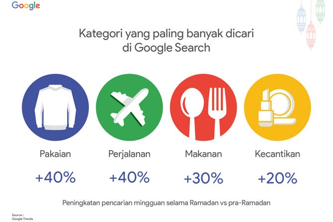 Penelusuran untuk pakaian tercatat mengalami lonjakan pencarian lebih dari 40 persen. Kemudian penelusuran lainnya yakni seputar perjalanan juga demikian, meningkat 40 persen. Di lain tempat ada pencarian terkait makanan dan kecantikan meningkat hingga lebih dari 30 persen dan 20 persen. Penelusuran untuk doa, ceramah, dan zakat juga naik signifikan selama bulan puasa.