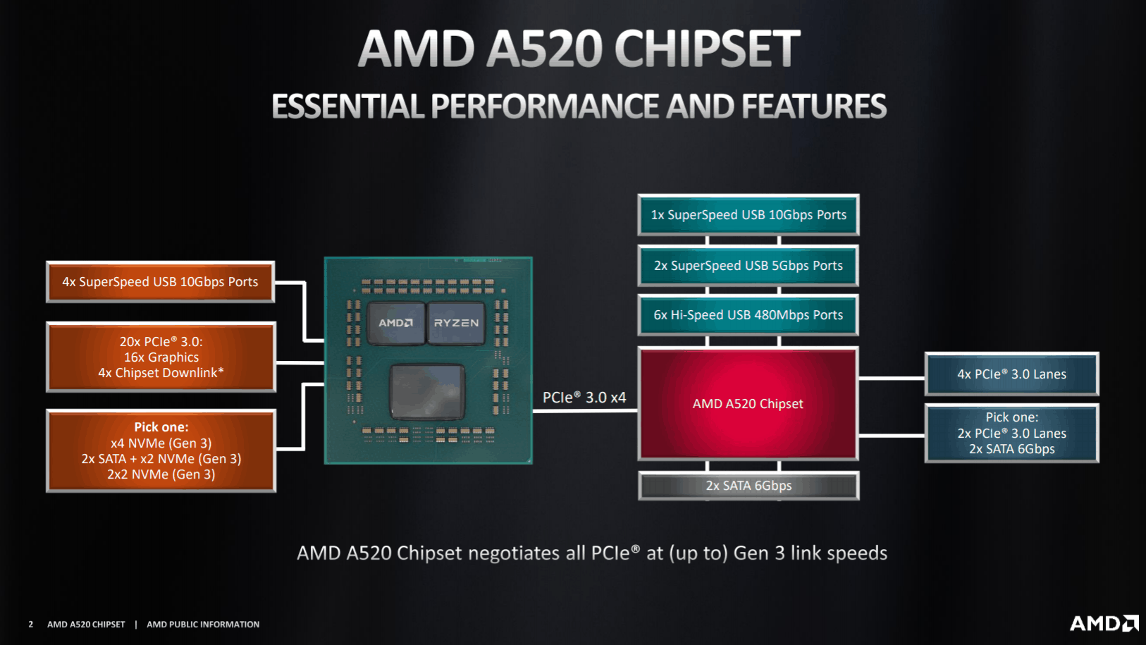 Chipset A520 mendukung kecepatan PCIe 4.0 sepenuhnya untuk PCIe 3.0, yang relatif lebih mudah untuk dihubungkan dan memberikan ruang lingkup ekstra bagi vendor motherboard untuk menghemat biaya dibandingkan dengan B550 dan X570. Chipset ini secara resmi mewakili jalur entry-level generasi AMD sekarang, dan seperti biasa berbasis di sekitar soket AM4 AMD.