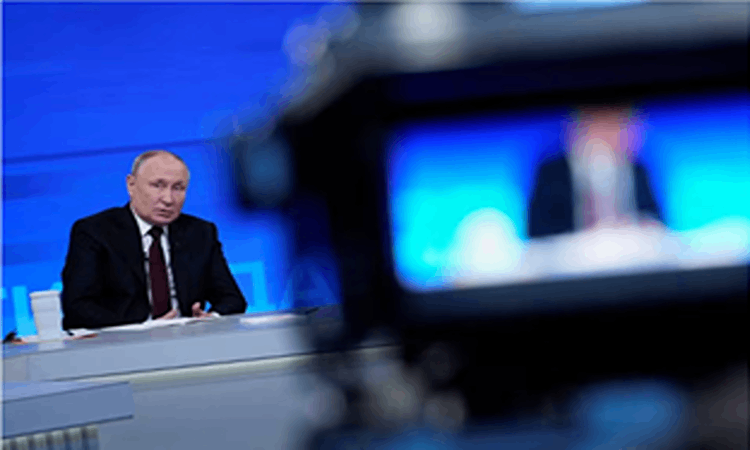 Presiden Rusia Vladimir Putin berbicara selama konferensi pers tahunannya di Moskow, Rusia 14 Desember 2023.A