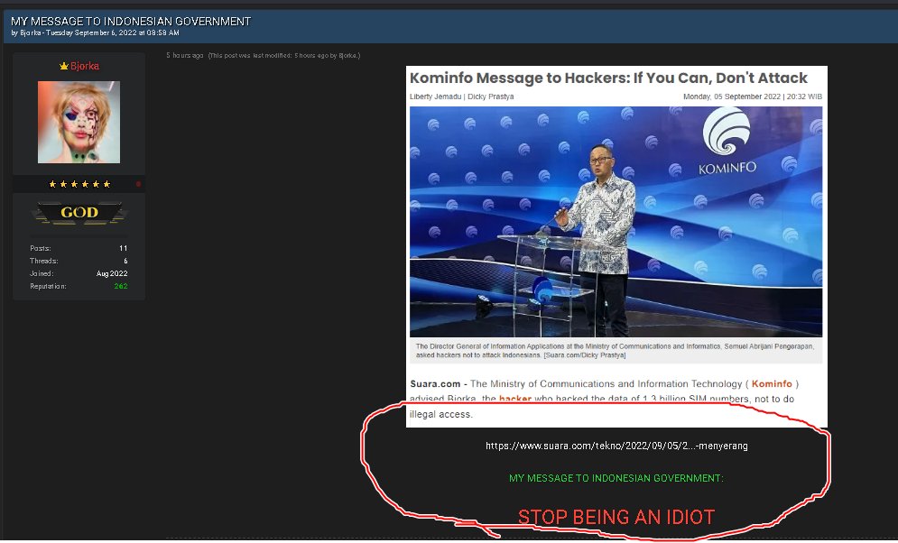 Hacker dengan username Bjorka mengirimkan pesan kepada Kemenkominfo untuk berhenti menjadi idiot. Ini disampaikan oleh penyebar kebocoran data registrasi SIM Card dalam salah satu unggahan di Breached Forums, laman internet yang biasa membeberkan adanya kebocoran data dan melakukan transaksi jual-beli.