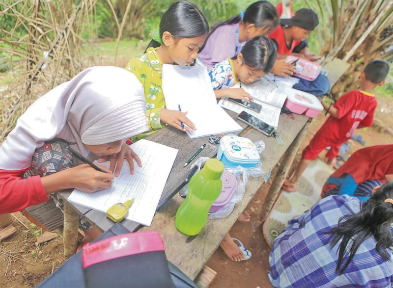 RAMA SIHOTANG/KP PENDIDIKAN DI IBU KOTA: Sejumlah pelajar yang bermukim di Muang Dalam, Kelurahan Lempake, Samarinda Utara, harus belajar di area perkebunan sawit yang berbukit demi mendapat jaringan internet. Mayoritas warga di wilayah tersebut belum sep