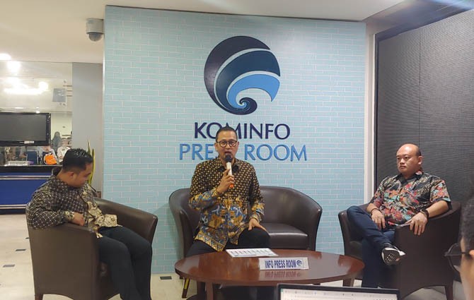 Direktur Jenderal Aplikasi dan Informatika Kemenkominfo Semuel Abrijani Pangerapan (tengah) saat jumpa pers peluncuran chatbot antihoaks di Jakarta, Jumat (12/4). (Rian Alfianto/JawaPos.com)