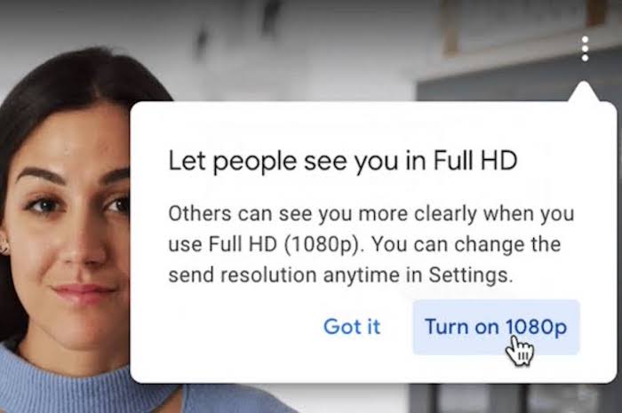 Pelanggan yang memenuhi syarat harus meningkatkan resolusi mereka di Google Meet secara manual, karena ini dinonaktifkan secara default. Prosesnya cukup sederhana: Saat Anda masuk ke panggilan video Google Meet baru, sembulan akan muncul dari tombol ubah (diberi label dengan tiga titik vertikal) yang menyatakan, "Biarkan orang melihat Anda dalam HD penuh" di samping informasi tentang pembaruan.