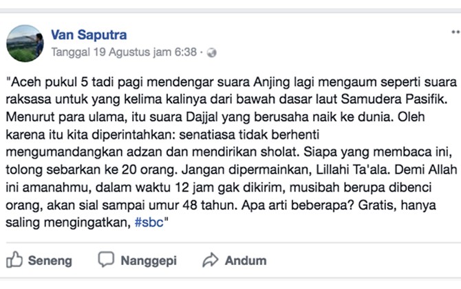Kabar palsu suara dajal terdengar di Aceh sebenarnya beredar sejak dua tahun lalu. Hingga 19 Agustus 2017, masih ada yang menyebarkannya melalui Facebook. Isinya, warga Aceh mendengar lolongan anjing yang mengaum mirip suara raksasa dari dasar laut Samudra Pasifik.