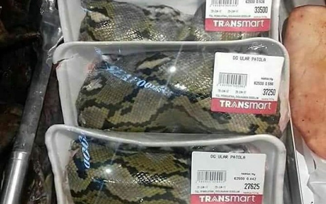Foto yang viral di Instagram dan Facebook itu bukan rekayasa. Daging ular atau biasa disebut patola tersebut memang disediakan di gerai Transmart Manado, Sulawesi Utara. Daging itu dijual karena ada permintaan dari masyarakat setempat. Pihak Transmart membenarkan adanya penjualan daging ular tersebut.