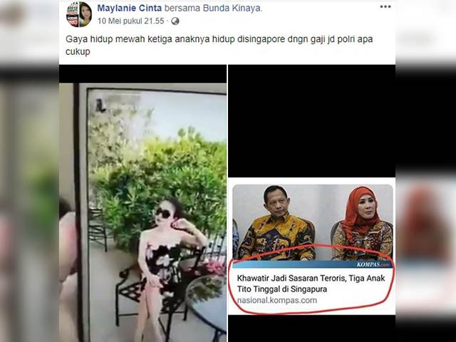 Kabar itu bisa ditemukan di posting-an pemilik akun Facebook Maylanie Cinta (fb.com/maylanie.cinta.5). Dia menyandingkan video tersebut dengan foto Tito Karnavian dan screenshot berita dari nasional.kompas.com yang berjudul Khawatir Jadi Sasaran Teroris, Tiga Anak Tito Tinggal di Singapura. Maylanie juga menuliskan status tentang gaya hidup mewah perempuan yang disebutnya sebagai anak Kapolri.