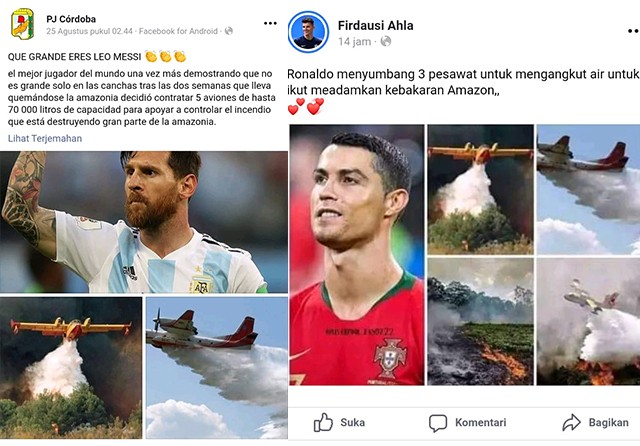 Setidaknya sudah ada dua nama pesohor lapangan hijau yang dicatut untuk membuat kabar hoax tentang pemadaman api di hutan Amazon. Selain Cristiano Ronaldo (CR7), foto Lionel Messi juga disebar bersamaan dengan foto-foto pesawat terbang yang sedang menumpahkan air dari ketinggian.