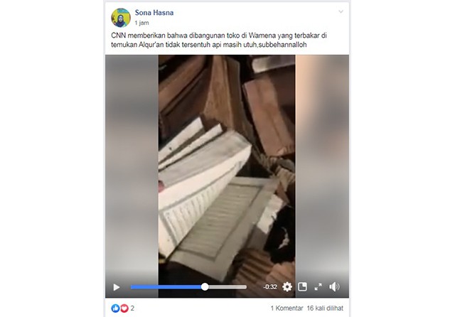 ”CNN memberikan bahwa dibangunan toko di Wamena yang terbakar di temukan Alqur’an tidak tersentuh api masih utuh,subbehannalloh,” tulis pemilik akun Facebook Sona Hasna (fb.com/saonah.depok) kemarin (10/10) dengan banyak sekali kesalahan ejaan.