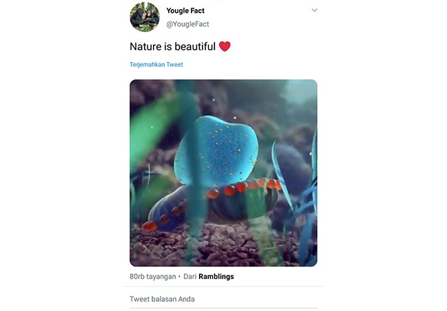 JawaPos.com - Video tentang biota laut yang menakjubkan beredar di beranda Twitter kemarin. Tampak sebuah hewan yang sangat lentur bergerak-gerak di dalam air. Bagian atas mirip ubur-ubur, sedangkan bagian bawahnya seperti cacing melingkar yang dikelilingi manik-manik. Video berdurasi 6 detik itu diunggah akun Yougle Fact (@Youglefact). ”Nature is beautiful,” tulis akun itu kemarin (7/11).